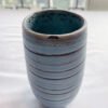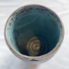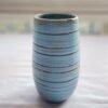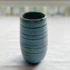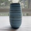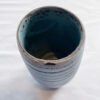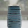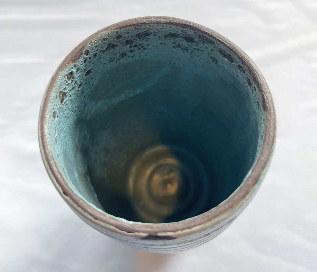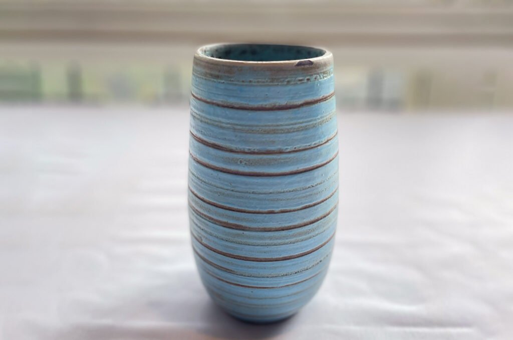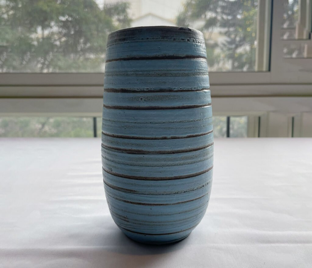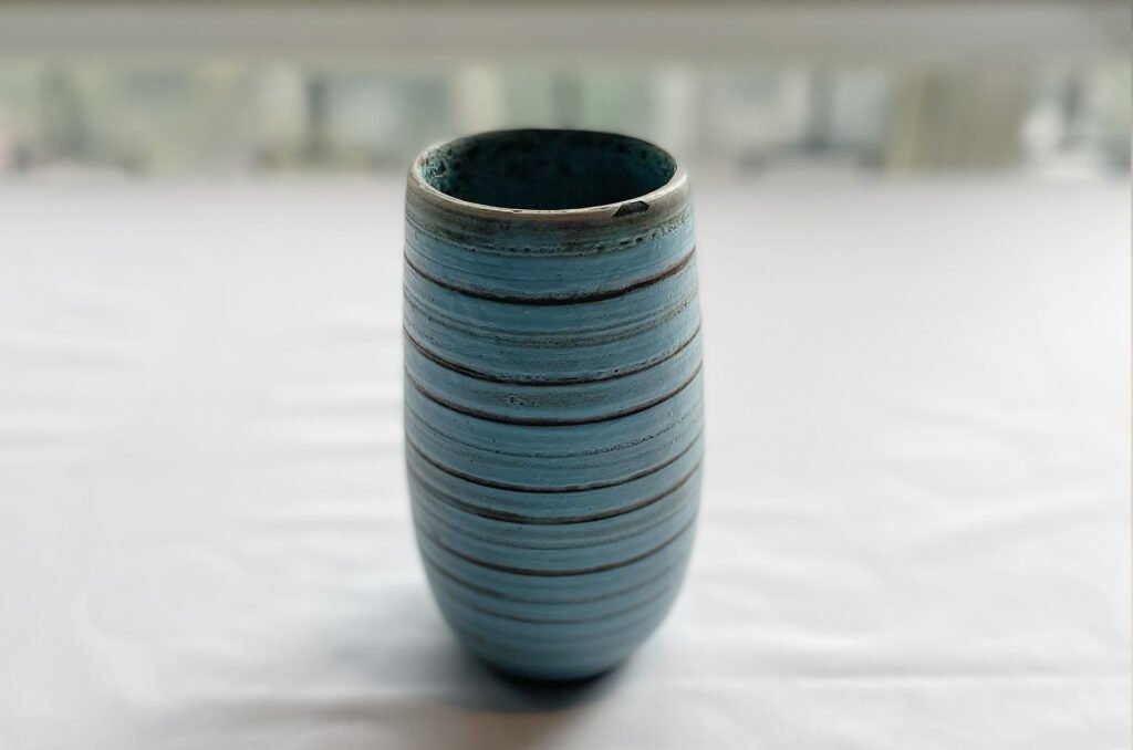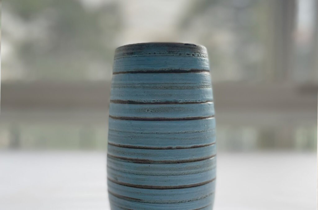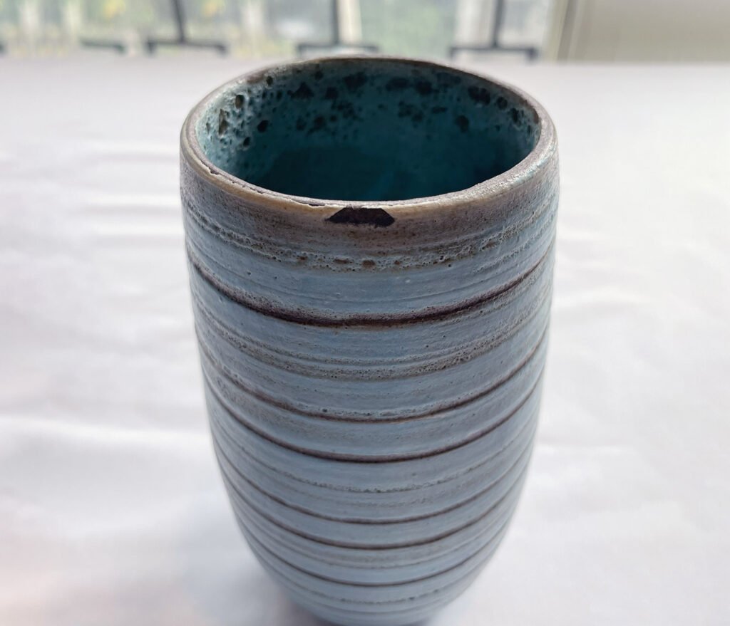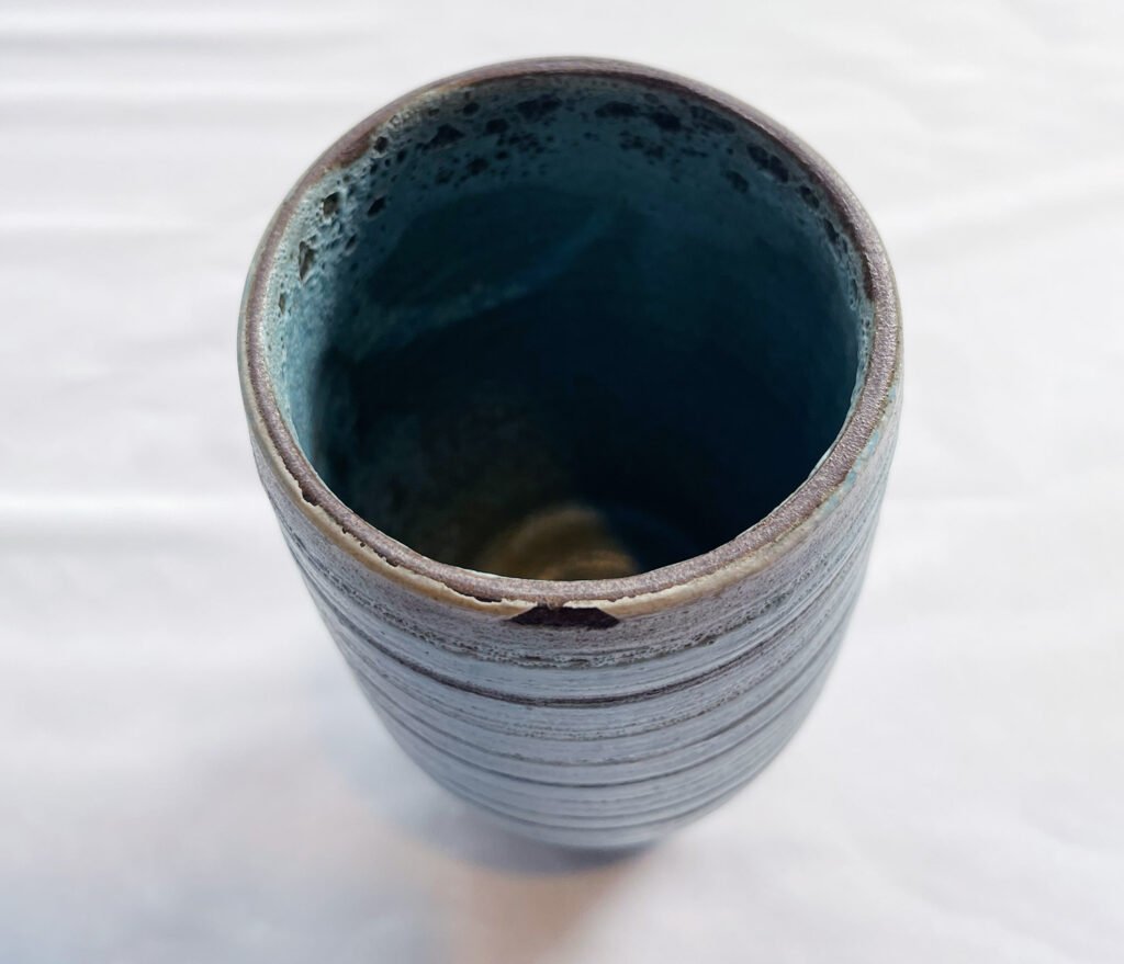 Made from volcanic black stoneware, this vase is coated with white clay and features a unique pattern of lines carved into the body, giving it an unfinished, “unbothered”, and unpolished look. The vase has a sky blue glaze, which has been blasted by the iron content in the clay to create a unique spotted texture on the inside. It’s truly a one-of-a-kind.